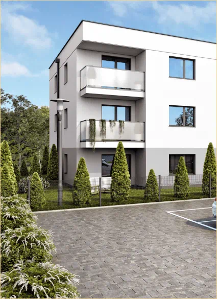 Piętrowy kameralny budynek a w nim NOWE 3 pokojowe mieszkania o pow. 65,41 m kw na parterze lub 64,41 m kw na I piętrze. Do każdego mieszkania przynależy ogródek.